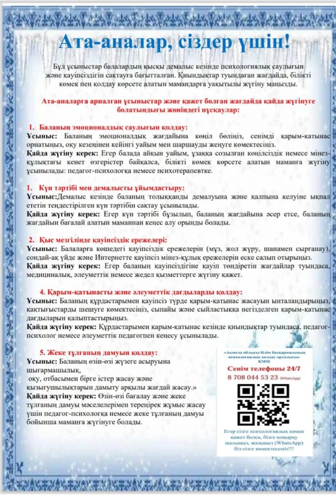 Ата-аналарға қысқы демалыс уақытында қауіпсіздік ережелері туралы түсіндірілді.